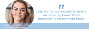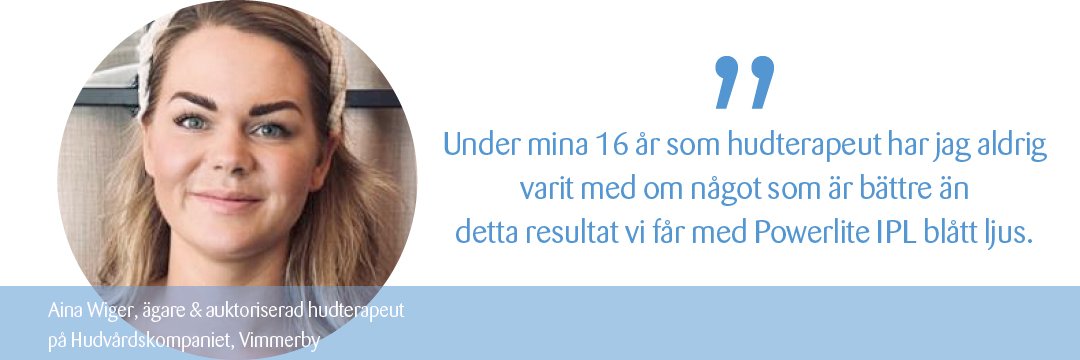 ”Har aldrig varit med om något bättre. Det funkar verkligen på alla. Att det går att få såhär fint resultat på acne under denna korta tid är fruktansvärt svårt. Men under mina 16 år som hudterapeut har jag aldrig varit med om något som är bättre än detta resultat vi får med Powerlite IPL blått ljus. Mitt specialområde är just acne och är så överlycklig att vi har möjlighet att erbjuda detta som hjälp. Med handen på hjärtat! Dessa resultat är så otroliga och alla som fått denna behandling är så nöjda. Så synd att det inte går att se hur huden är under. För när man tar på den så är skillnaden enorm. Hela strukturen är så sjukt fin!”
