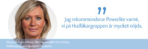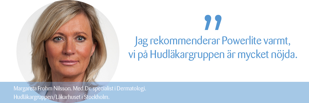 ”Powerlite800 har visat oss fantastiska resultat i hudföryngring, rosacea, kärl, solskador, acne och hårborttagning. Jag rekommenderar Powerlite varmt, vi på Hudläkargruppen är mycket nöjda.”
